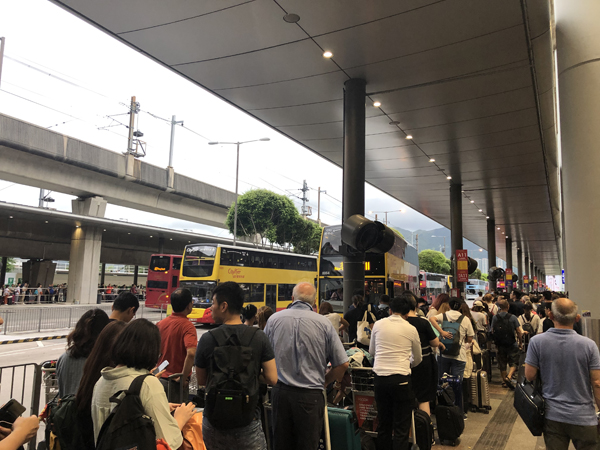 【17:58】機場巴士服務重開,大批旅客等候上車,各條出市區的巴士路線都排起一條條人龍,場面頗為混亂,有旅客表示估計需要一小時才能上車。