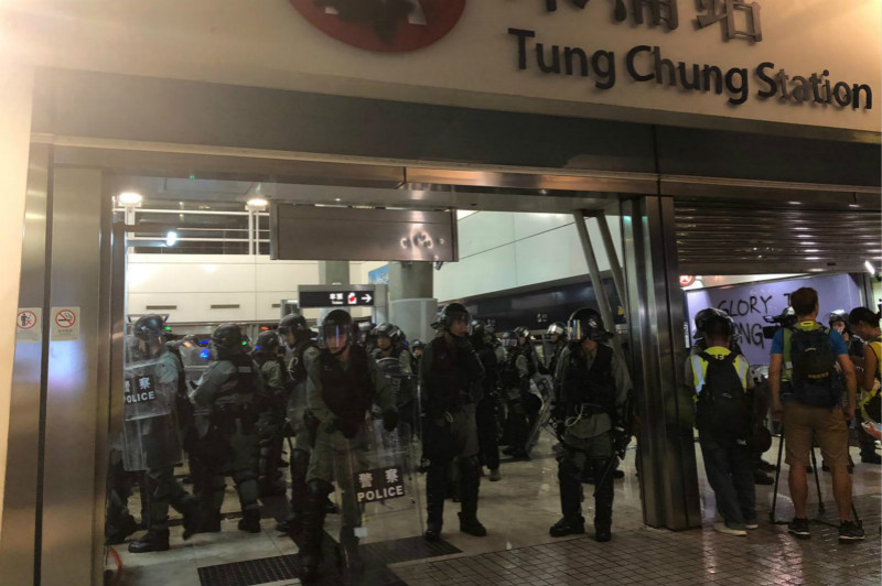 【18:50】防暴警及速龍小隊進入港鐵東涌站,並走進列車車廂截查可疑人士。另外,港鐵青衣站亦暫時封閉,大批防暴警察於站內築成防線,禁止市民經青衣城商場進入站內。