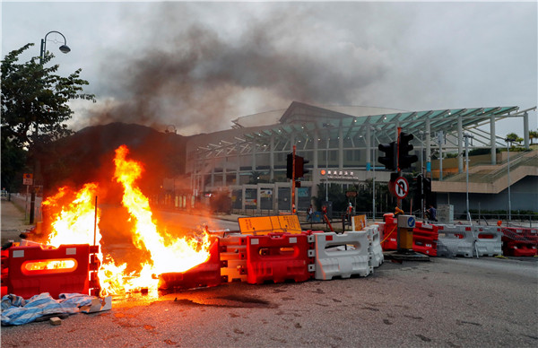 【香港商報网訊】記者馮仁樂報道:昨日,有示威者無視機場禁制令,到機場附近以各種形式堵塞通往機場的交通以影響機場運作,包括闖入機鐵路軌、堵塞機場出口、破壞港鐵站內設施等。受破壞擾亂事故影響,機場快線、東涌線、迪士尼線、機場巴士服務一度暫停,機場交通全面癱瘓。令人髮指的是,黑衣狂徒竟然在東涌縱火焚燒國旗,港府對此表示最強烈譴責。