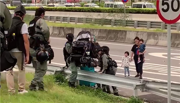 防暴警有溫情時。昨日,示威者塞機場行動令機場快線列車服務停止,大批旅客只能拖篋步行前往香港國際機場。其中,有一家人試圖越過圍欄前往機場,多名防暴警察見狀上前協助,幫忙抱起小童並搬運嬰兒車及行李。網絡圖片