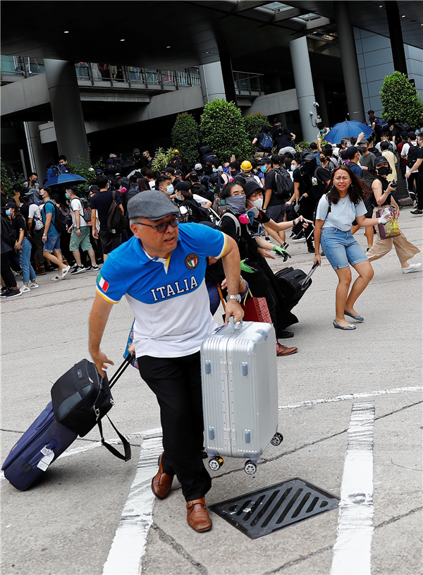 昨有示威者無視機場禁制令以各種形式堵塞通往機場的交通,包括堵塞機場出口、破壞港鐵東涌站內設施、在東涌游泳池旁縱火燃燒路障、向機場快線扔石塊等。路透社