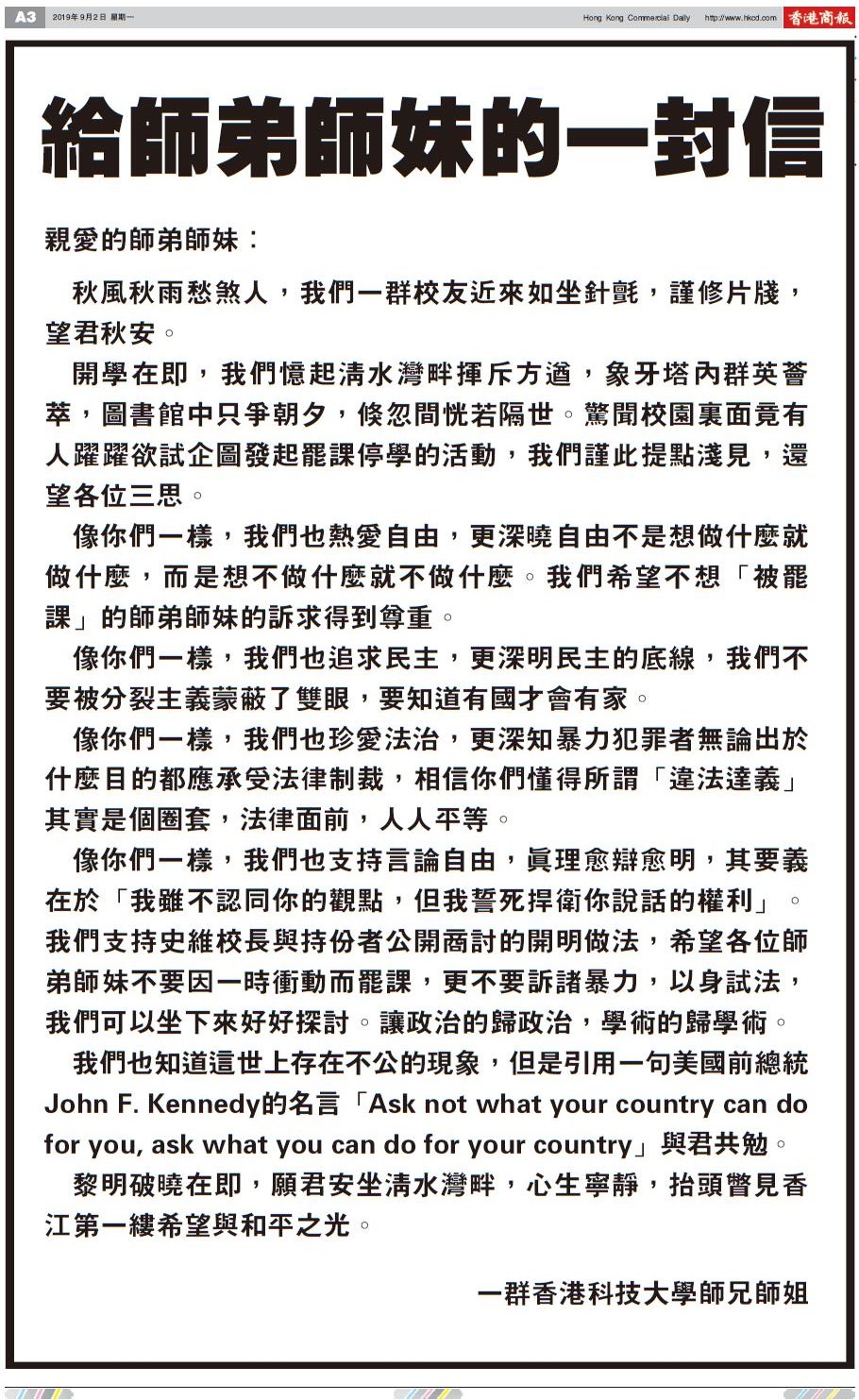 香港科技大学的学生给香港商报写来一封信,呼吁师弟师妹们不要「被罷課」。全文如下: