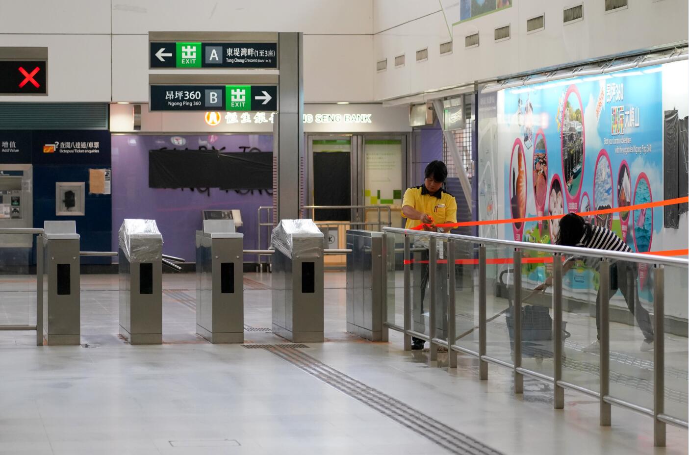 港鐵東涌站日前遭受暴徒嚴重破壞,部分出入口和閘機昨日關閉停用,有工人在現場清理。 中通社