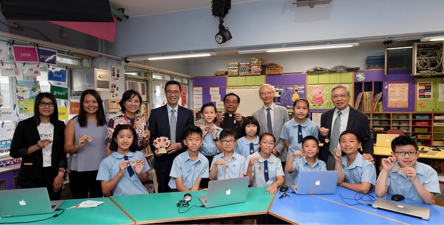 楊潤雄(後排左四)開學日探訪油麻地天主教小學,與該校校長余佩琴(後排左三)及學 生合照。 中通社