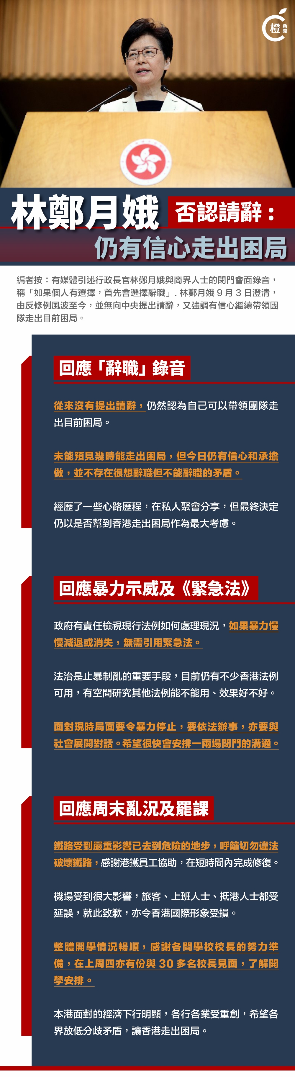 林鄭月娥记者会前發言,她稱這兩個多月來,香港市民對此感到心痛和焦慮,特區政府會盡力回復社會秩序。她首先談及開學情況,稱整體開學情況暢順,感謝校長的努力,稱自己上周聯同教育局局長與30多位校長見面,為開學做準備和與學生傾談了解情況,她感謝校長和教師。