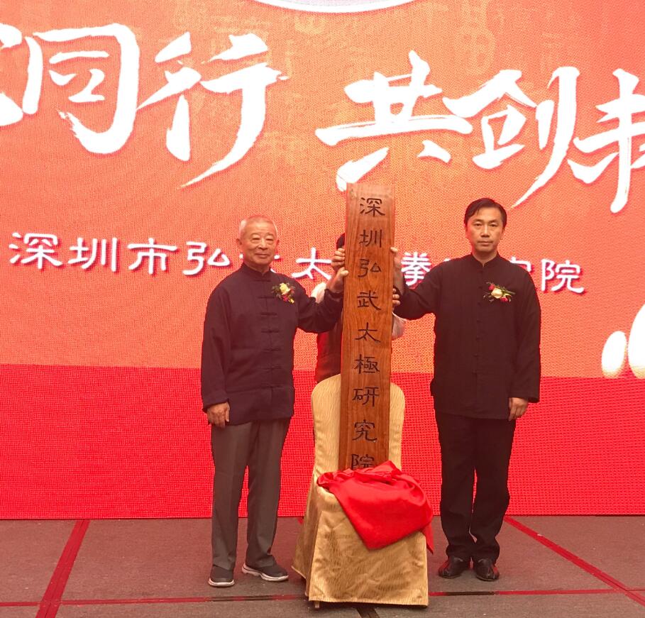 著名武術家吳彬(左),與深圳弘武國醫館創辦人、孫式太極拳第四代嫡傳李斌,為「深圳弘武太極研究院」揭牌
