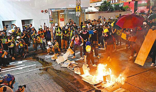 暴亂活動期間,不少身穿反光黃間背心的「記者」圍着警方拍攝。大公报