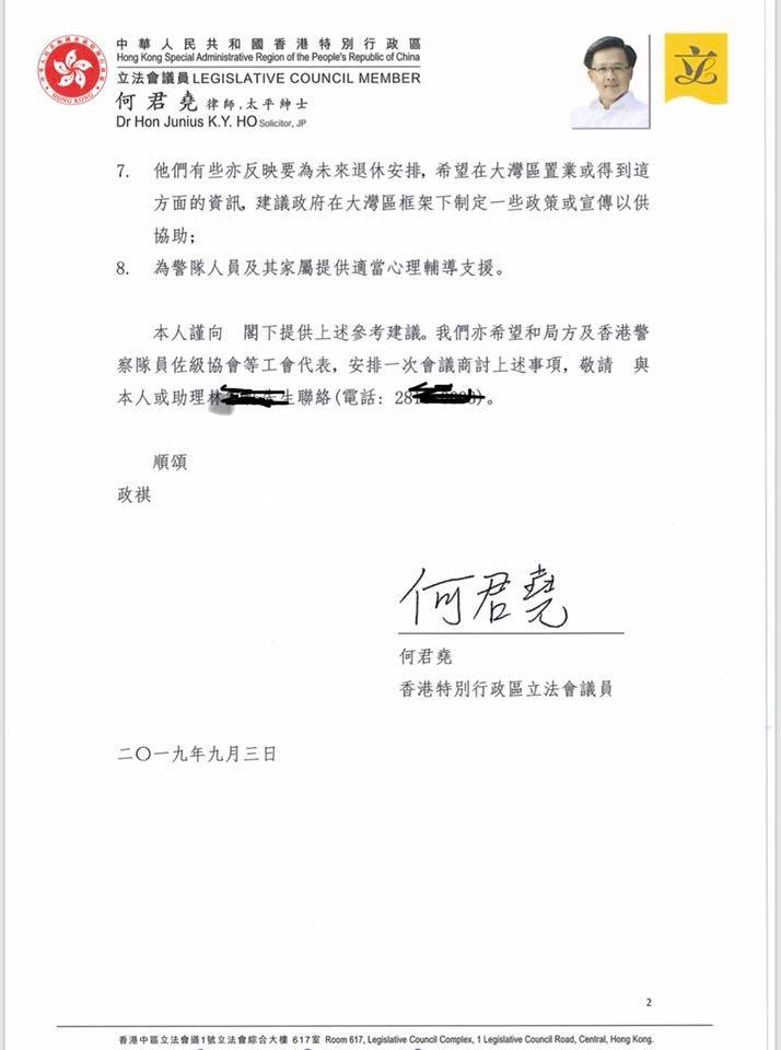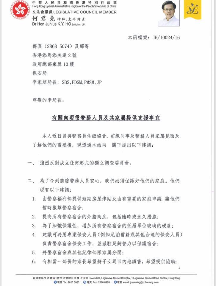 【香港商报网訊】修訂《逃犯條例》爭議引發連串示威,引發多場激烈的警民衝突,有建制派憂開學後有警察子女遭欺凌。立法會議員何君堯昨日(3日)去信保安局局長李家超,提出局方為警員及其家屬提供支援,8項建議包括提高警察宿舍外牆高度、協助警員子女去內地讀書、協助警員退休後到大灣區置業等。