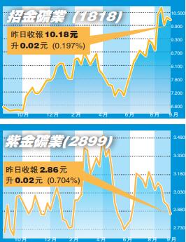 此外,該行調低紫金礦業(2899)2019至2021年盈利預測13%、5%及25%,以反映金價上升的預期大部分被黃金數量下降、上半年鋅現金成本上升,以及管理及財務成本上升所抵銷。該行下調對其目標價7%,由4.3元降至4元,維持「買入」評級,相信該行可受惠於銅價及金價上升。