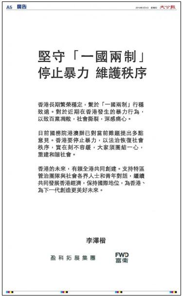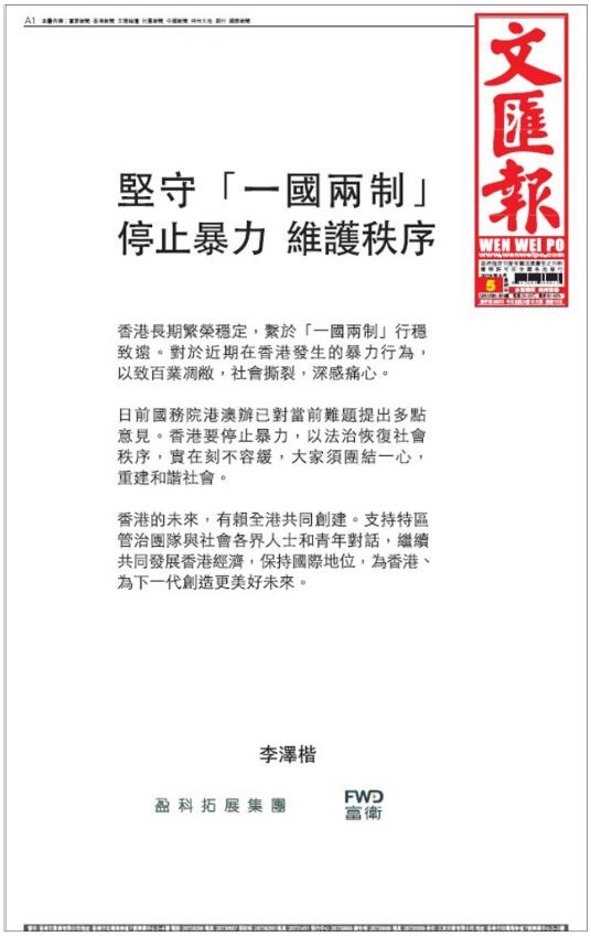 盈科拓展集团主席、李嘉诚次子李泽楷,以“盈科拓展集团”及旗下“富卫保险”的名义,在《大公报》、《文汇报》和《东方日报》等多份香港报纸刊登广告,呼吁坚守“一国两制”,停止暴力,维护秩序,支持特区政府管治团队与社会各界人士和青年对话。