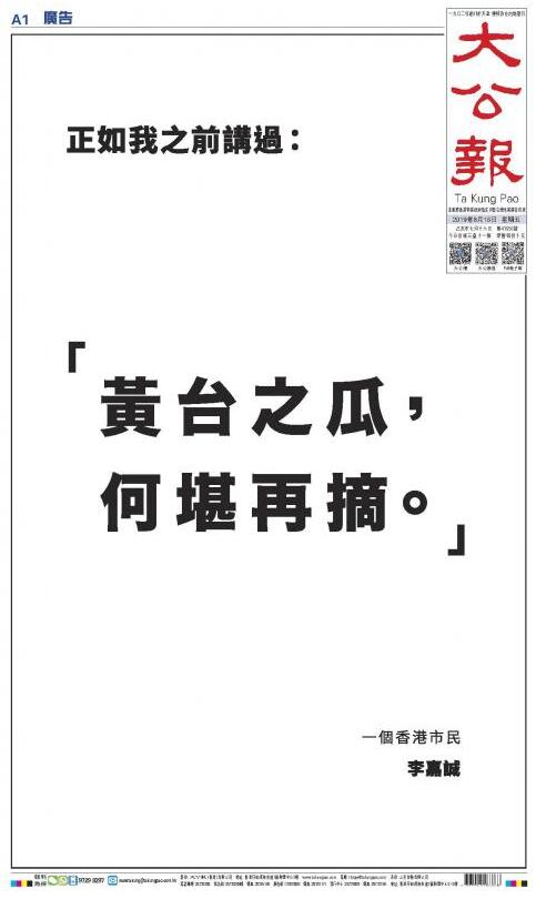 另一个版本则刊登了署名为“一个香港市民 李嘉诚”的广告声明。声明中写着,“正如我之前讲过:‘黄台之瓜,何堪再摘。’”