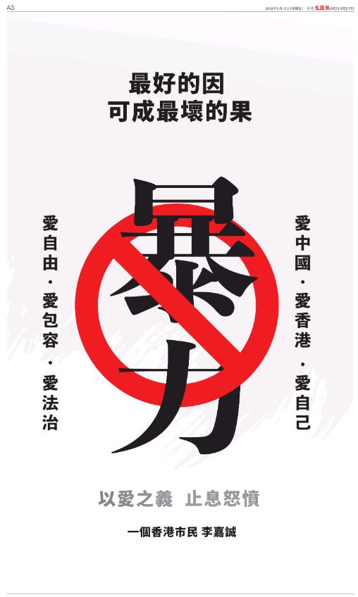 该广告有两个版本,其中一个版本正中间为一个禁止暴力的图标,左侧写着“爱自由·爱包容·爱法治”,右侧写着“爱中国·爱香港·爱自己”。正上方的标题则为“最好的因 可成最坏的果”,下方写有“以爱之义 止息怒愤”,署名为“一个香港市民 李嘉诚”。