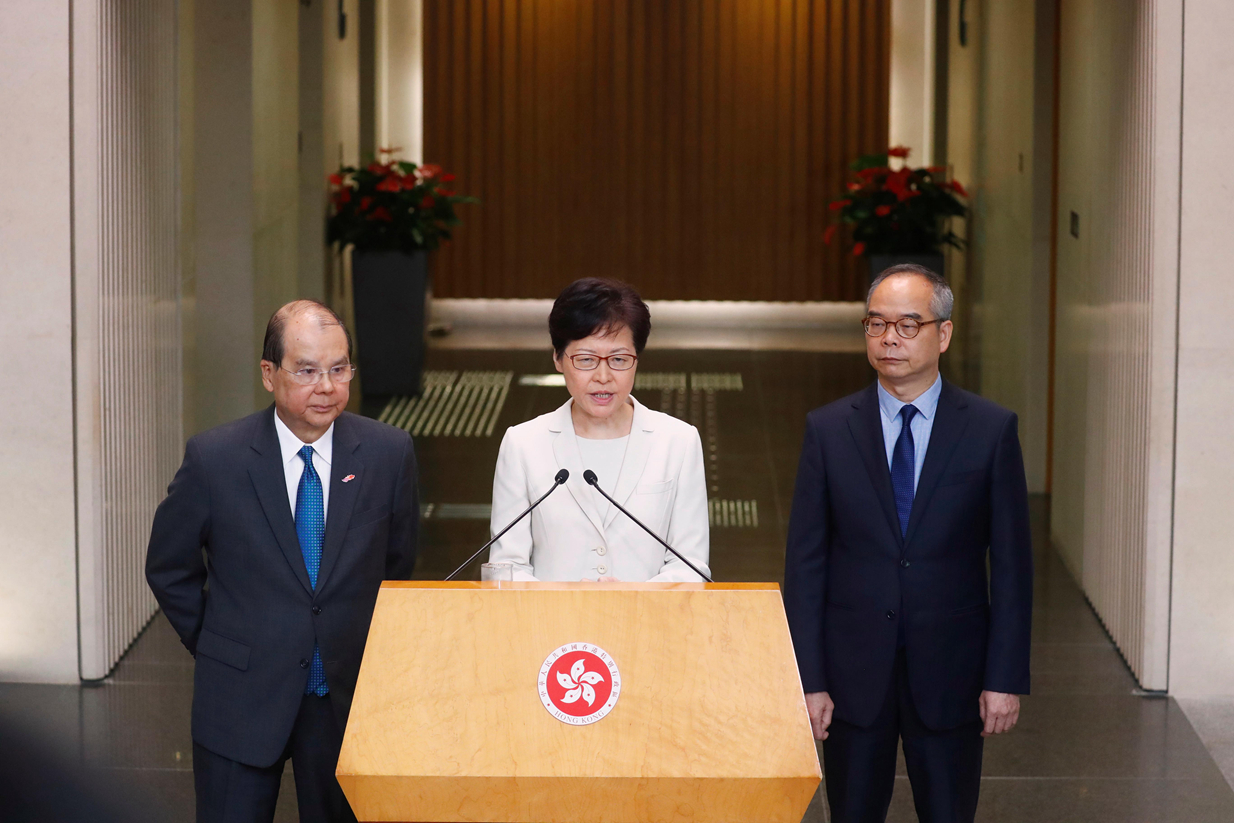 林鄭月娥昨早聯同政務司司長張建宗、民政事務局局長劉江華在特首辦會見傳媒。林鄭表示,9月4日發表了錄像講話,詳細和完整回應了有關修例工作中社會的「五大訴求」,並提出四項行動,希望打破香港今天的困局。