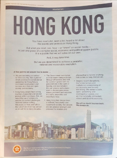 廣告指出,國際社會可能看到和聽到很多關於香港示威的情況,以及很多分享在社交媒體上的內容,但這只是香港複雜的社會、經濟、政治拼圖中的一塊。特區政府會自行處理這些問題,決心以和平、理性及合理的方式解決,但是需要時間。