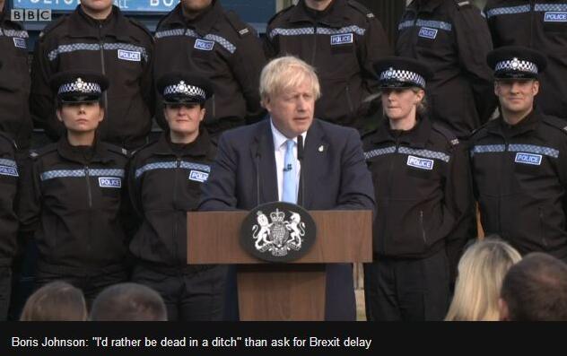 综合英国《卫报》、BBC当地时间9月5日报道,约翰逊当天在西约克郡的一所警察培训学院发表讲话。当记者问他能否承诺不会去欧盟要求脱欧延期时,他表示,自己“宁愿死在沟里”(rather be dead in a ditch),也不愿同意推迟脱欧时间。当时,现场不少人,包括站在约翰逊身后的警察,都忍不住笑了。