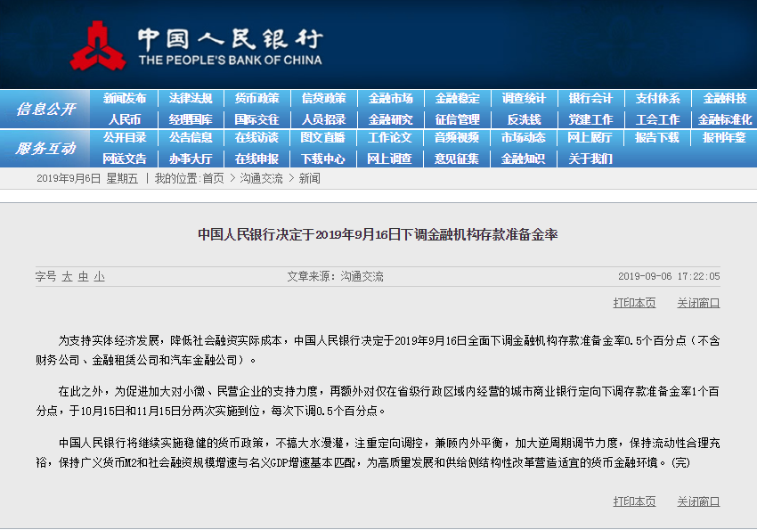 爲支持實體經濟發展,降低社會融資實際成本,中國人民銀行决定于2019年9月16日全面下調金融機構存款準備金率0.5個百分點(不含財務公司、金融租賃公司和汽車金融公司)。