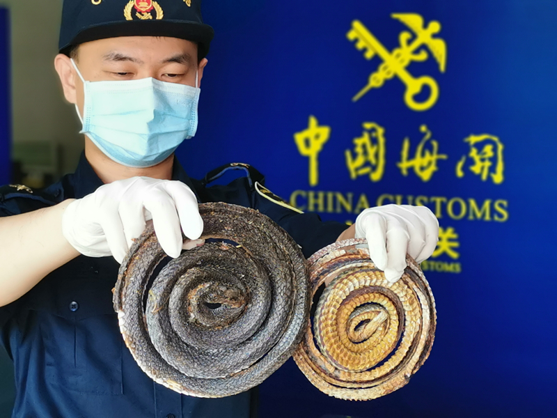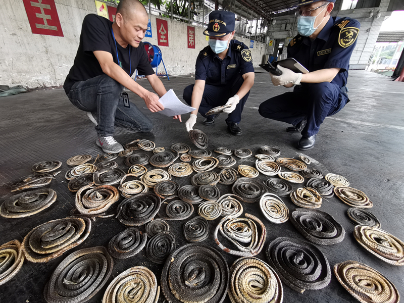 广州海关在进口货物中查获濒危物种滑鼠蛇干、南洋眼睛蛇干。李炜 摄