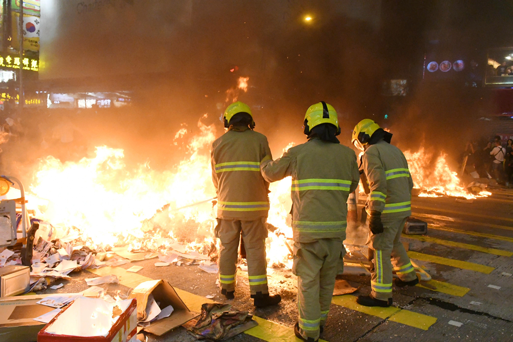 暴徒在旺角彌敦道及山東街交界放火燒雜物,消防員到場灌救。記者馮瀚文攝