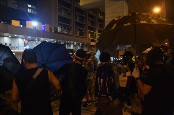約1小時後,警署外一帶已聚集數千人,不斷有人以鐳射槍照向警署窗戶及警員,更大聲唱有侮辱警員的改編歌進行挑釁。大批防暴警在警署內佈防及一度舉起藍旗示警。期間,警署外有一名白衣男子被誣衊帶刀,他即高舉雙手面斥暴徒誣衊,結果被黑衣男女圍毆。白衣男一度負傷向一名黑衣男還擊,防暴警由警署衝出將白衣人勸離,並護送他入警署暫避。