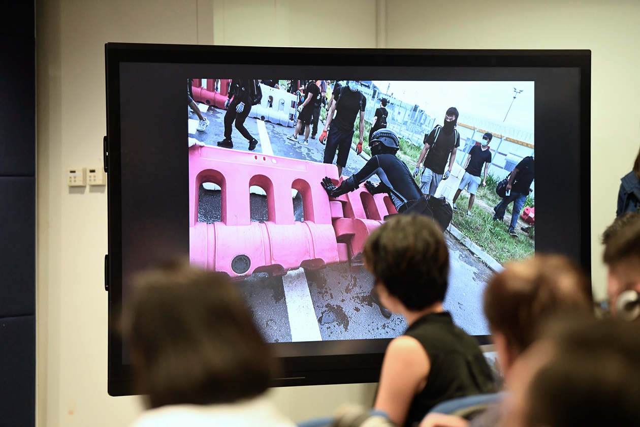 警方於例行記者會播放示威者早前堵塞機場道路情況。中通社