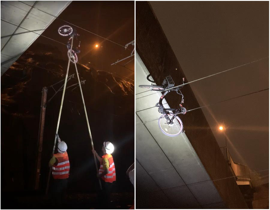 日前,港鐵工程人員於非行車時間發現大學站與火炭站之間一段架空電纜上掛有一架單車,附近路軌範圍內亦有不少雜物,工程人員即時移走相關物件。港鐵提供圖片