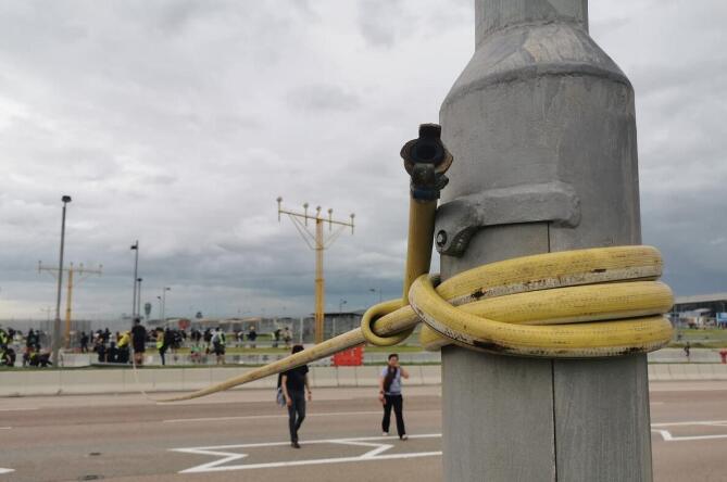 9月1日,有暴徒使用水管連接路燈來設置路障,阻礙機場高速公路的過往交通。(大公文匯全媒體)