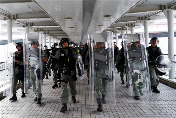 警方及不同部門昨日在機場內外及沿線鐵路站、公路嚴密部署。上圖為警員在機場附近的東涌地鐵站布防。路透社/中新社