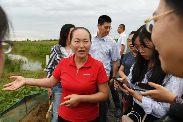 小崗村農戶殷玉榮介紹稻蝦共養農田情況