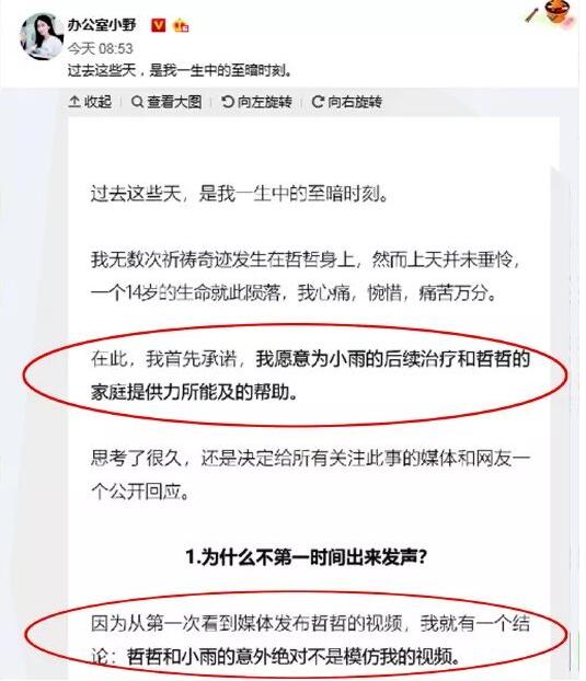 长文中,“办公室小野”表示愿意为小雨的后续治疗和哲哲的家庭提供力所能及的帮助。对于为什么不第一时间出来发声,“从第一次看到媒体发布哲哲的视频,我就有一个结论:哲哲和小雨的意外绝不是模仿我的视频。”“办公室小野”称,易拉罐爆米花不是她独创的,她的视频发布于2017年2月,但网络上早在2016年就有了图文视频教程。