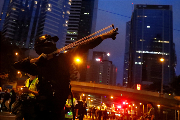 隨着示威浪潮升級,暴徒的衝擊行動更有組織和預謀,不少暴徒有備而來,身穿頂尖級的保護裝備,護甲、頭盔、眼罩,有人還自製巨型彈叉發射器,用來離遠拋擲磚頭攻擊警員,射程更遠,威力更猛;有人改裝氣槍,準確地向遠處警員施襲。
