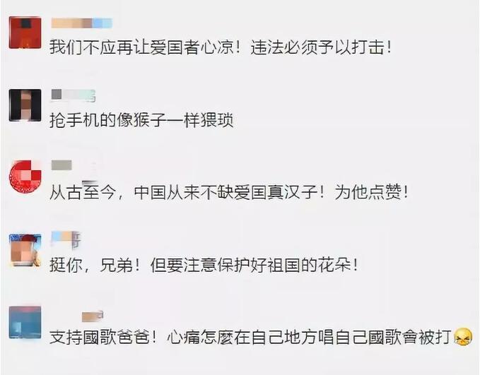 不过该男子不惧围攻、勇唱国歌的行为受到了广大爱国网友的一致好评!而袭击他的人则被鄙视。