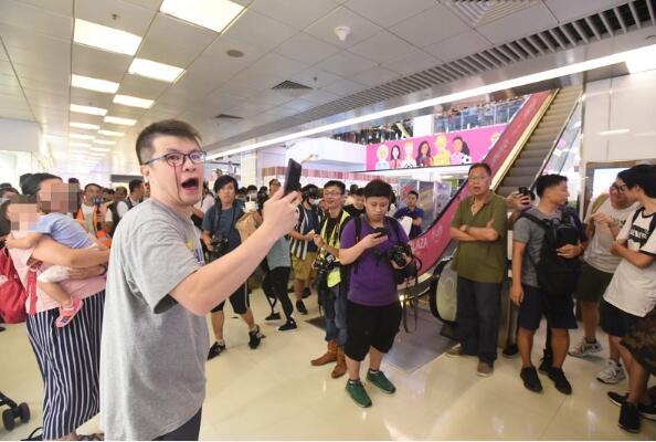 昨晚7点左右,有示威者聚集在淘大商场,高唱讽刺警察歌曲。期间一名男子带着3个小孩经过,见状高唱国歌。有示威者拍摄唱国歌的男子,该男子也举起手机反拍,之后与在场众人发生口角。