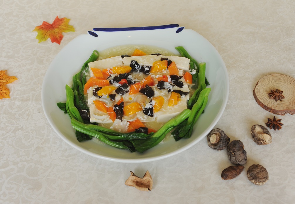 賀街豆腐四寶燴食材包括無公害南瓜、賀街水豆腐、木耳及鮮百合等,養血駐顏、疏通腸胃。