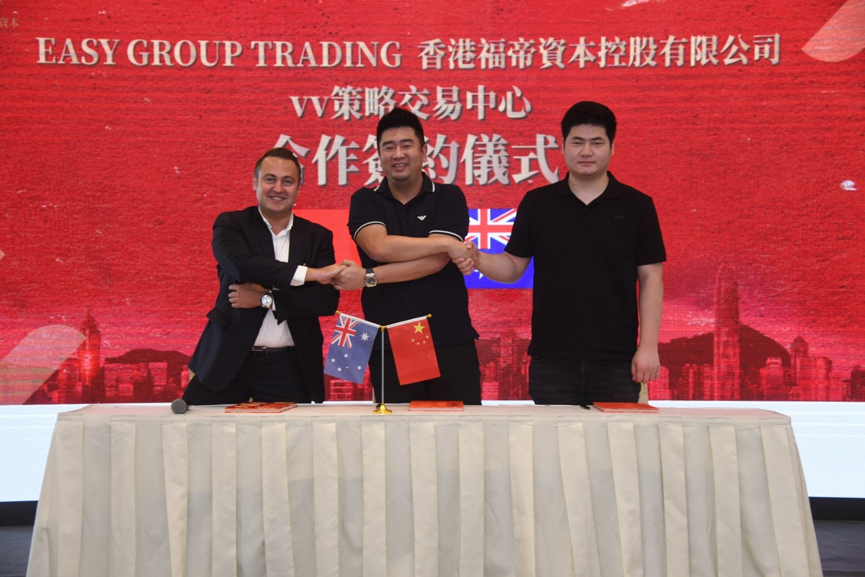 福帝資本董事長祁鵬(中),Easy Group Trading代表(左),VV策略交易中心亞太區負責人Totti(右)共同簽署戰略合作協議。