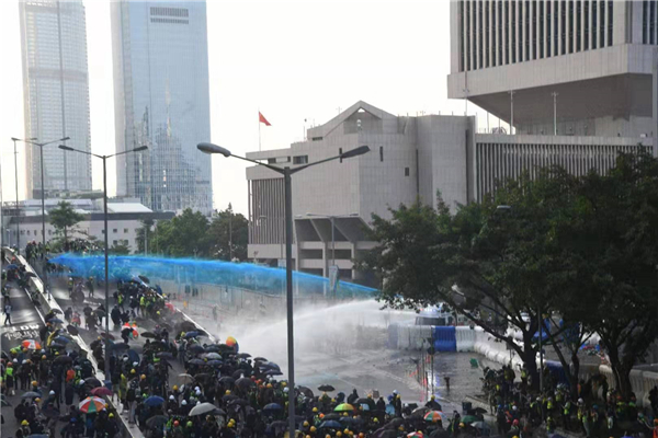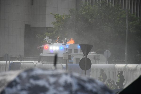 【17:55】暴徒向政總投擲汽油彈,并向水炮車投擲汽油彈,水炮車一度起火但很快熄滅。