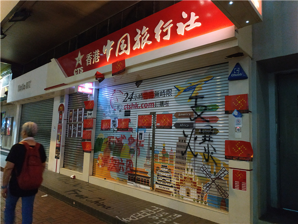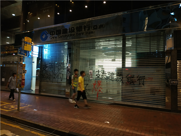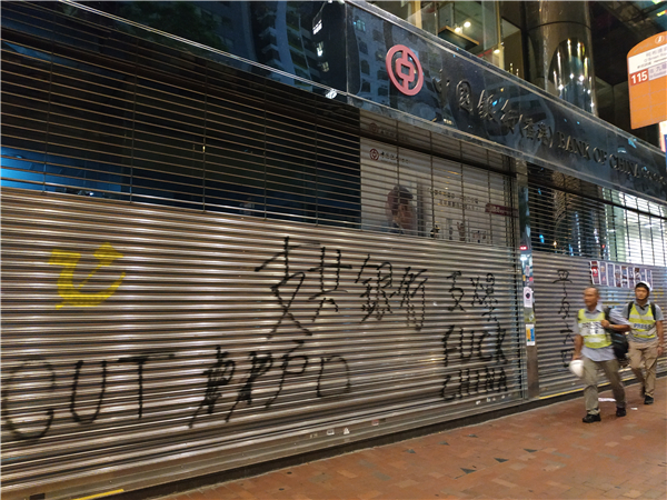 【18:49】多個中资机構铁閘被喷油漆。(记者冯瀚文)