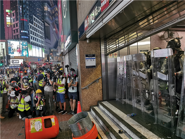 【19:44】防暴警察在銅鑼灣站內戒備,有示威者圖闖入站內,警方施放催淚彈驅趕。(記者馮瀚文)