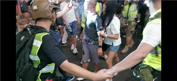 【20:38】示威者由金鐘一路撤退到銅鑼灣,人群圍堵現場的警察,警察退到地鐵站內,銅鑼灣地鐵站隨后封站,示威者強行撬開金百利商埸附近的地鐵閘門,防暴警察從站裏衝出來,向現場施放三枚催淚彈驅散人群,之後警方和水炮車一路向砲台山方向推進。(记者木子)