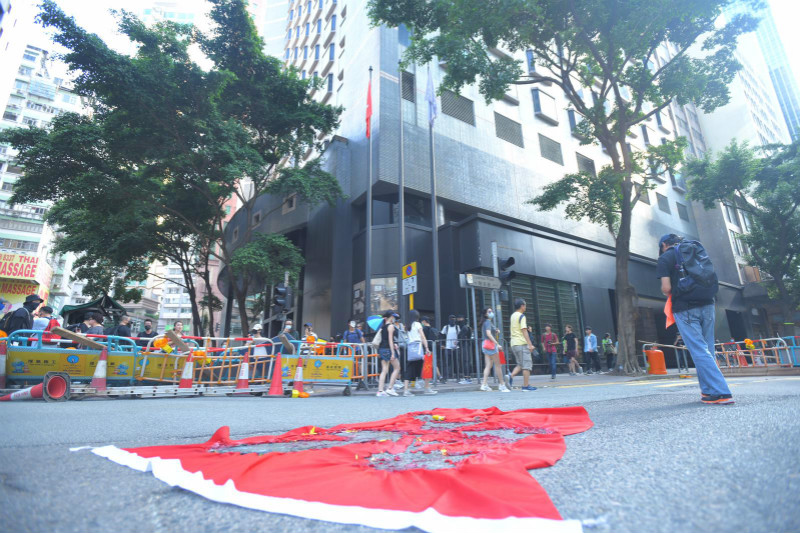 有國旗被示威者扔在地上燒毀。圖:星島