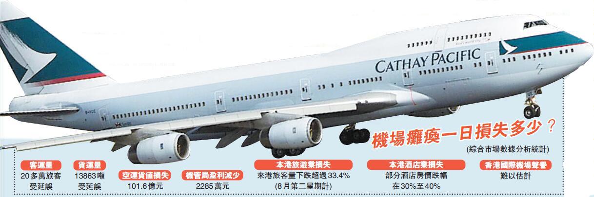 除了香港聲譽損失難以估量,機場癱瘓亦對本港經濟造成重創。樂鞏南指出,航空是香港的經濟支柱之一,機場營運受到影響,會連帶貿易、旅遊、貨運等其他方面都遭受損失。
