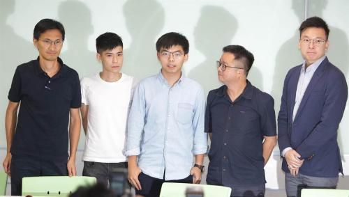 黄之锋(中)、朱凯迪(左一)和岑敖晖(左二)勾结台湾民进党。与林飞帆会面(右一)。图片来源:台湾《中时电子报》/季志翔 摄