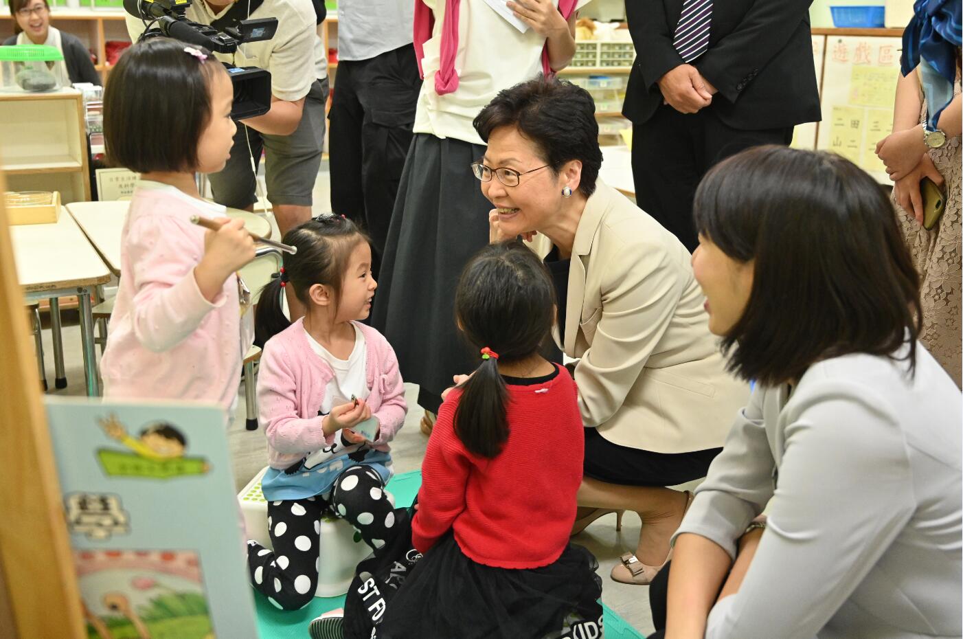 行政長官林鄭月娥(右二)昨午探訪銅鑼灣一間幼兒園,並與園內小朋友交談。