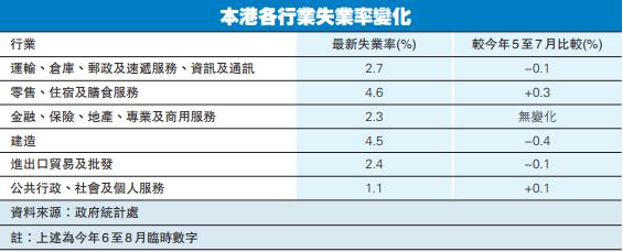 勞工及福利局局長羅致光表示,經季節性調整的失業率在6月至8月維持於2.9%。就業不足率亦保持不變,為1%。然而,總就業人數略低於1年前水平。按主要行業分析,在本地消費疲軟及近期社會事件導致訪港旅客人次急跌情況下,零售、住宿及膳食服務業合計的失業率,較上一個期間進一步上升。建造業的失業率較上一個期間下降,但該行業的就業人數受建造活動疲弱所影響而繼續按年下跌。