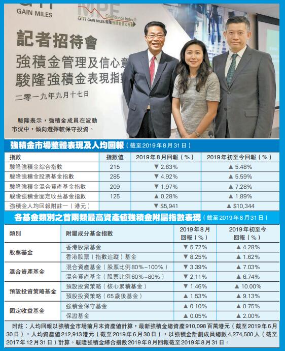 就強積金表現,駿隆集團常務董事陳銳隆指出,混合資產基金於8月份以及年初至今回報表現,比股票資產基金理想,主要受惠歐美市場表現良好,及債券受央行減息推高價格,全球的負利率債券總市值已高達17萬億美元。