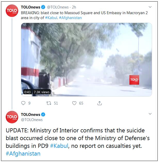阿富汗媒体“TOLO news”17日报道,喀布尔的爆炸发生在马苏德广场(Massoud Square)与美国驻阿富汗大使馆附近。