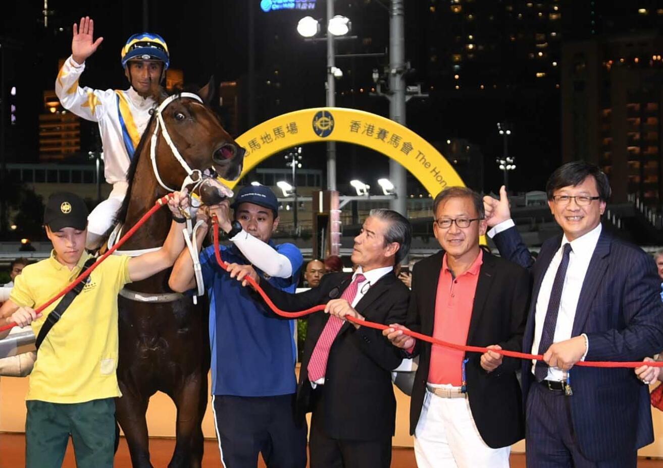「天祿」 今年 7 月 10 日勝出跑馬地 賽事,何君堯(右)與 一眾友好拉頭馬。