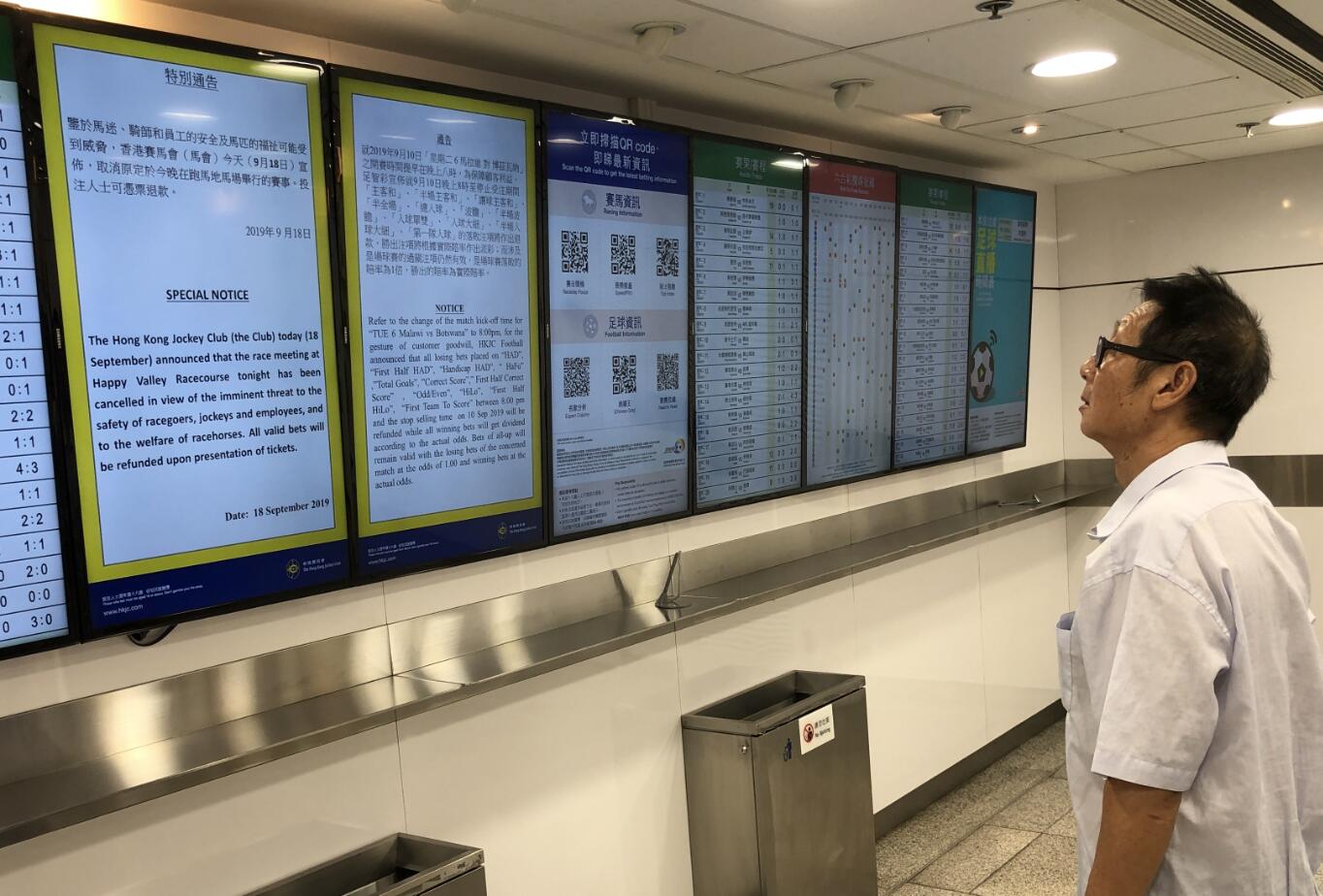 馬迷失望地看着馬會取消賽事的通 告。 記者 崔俊良攝