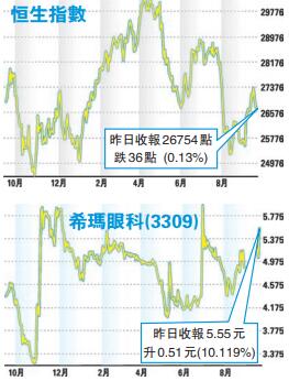 希瑪眼科(3309)上半年營業額上升37.6%至2.65億元,盈利上升180.8%至3375萬元。香港業務的平均手術費增長2.6%至34219元,由於香港眼科醫生人數增加,手術數量增加34.8%至2449宗。內地業務在深圳及北京眼科醫院支持下,手術數量增加54.0%至4621宗,平均手術費增加4.6%至15630元。