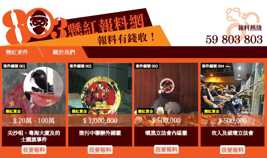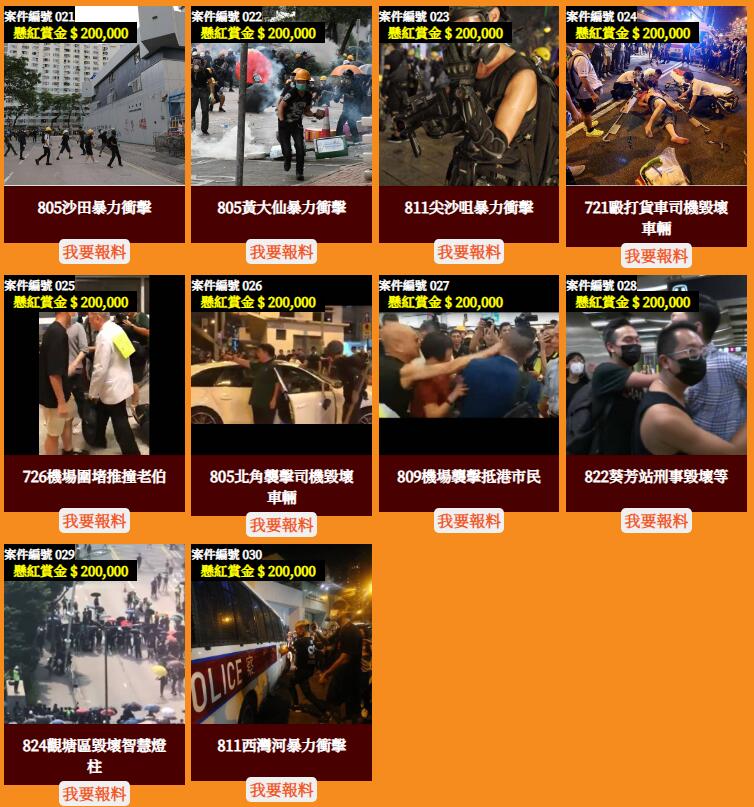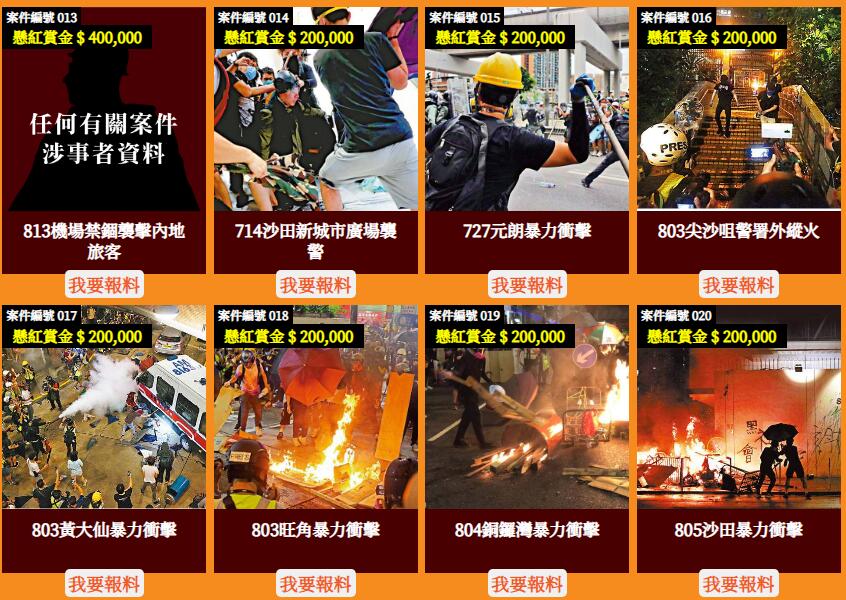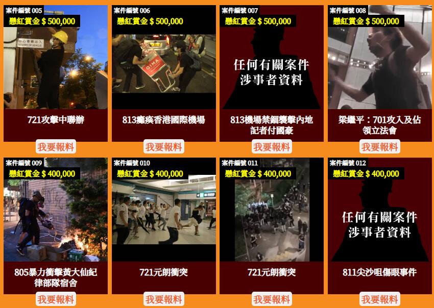 「喷黑立法会内区徽」、「攻入及破坏立法会」、「721攻击中联办」、「813瘫痪香港国际机场」、「813机场禁锢袭击内地记者付国豪」等6宗案件懸紅为50万港币;