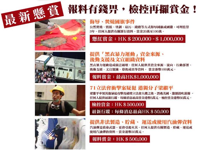 任何人提供「黑衣暴力運動」的資金來源、流向、行動部署、後勤支援、文宣組織、幕後成員等資料,懸红100萬元;